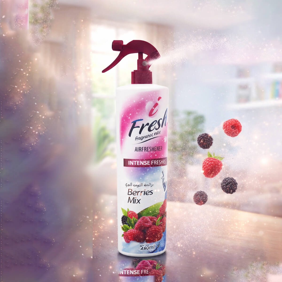 استمتع برائحة الفواكه المنعشة مع معطر الجو Fresh برائحة التوت البري الذي يملأ المكان برائحة حلوة ومنعشة تدوم طويلاً.